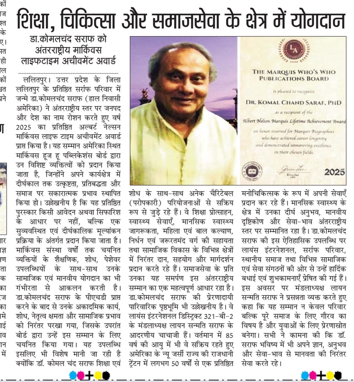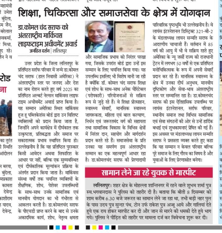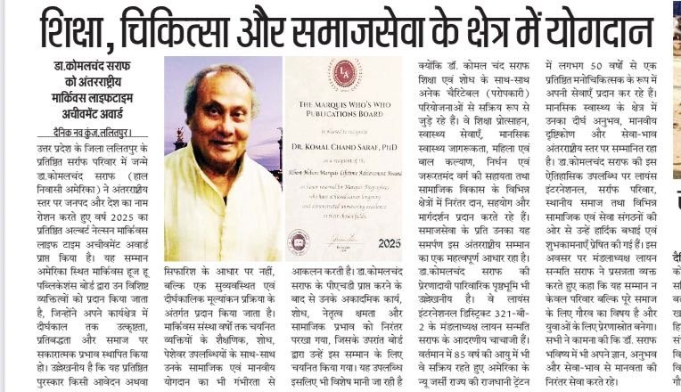 ЁЯЩП рд╣рдорд╛рд░реЗ рдкреВрдЬреНрдп рдПрд╡рдВ рдЖрджрд░рдгреАрдп рдЪрд╛рдЪрд╛ рдЬреА, рдбреЙ. рдХреЛрдорд▓ рдЪрдВрдж рд╕рд░рд╛рдл рдХреЛ рдЕрдВрддрд░рд░рд╛рд╖реНрдЯреНрд░реАрдп ЁЯПЕ Marquis Lifetime Achievement Award 2025 рд╕реЗ рд╕рдореНрдорд╛рдирд┐рдд рд╣реЛрддреЗ рджреЗрдЦ рд╣реГрджрдп рдЧрд░реНрд╡ рдФрд░ рднрд╛рд╡рдирд╛рдУрдВ рд╕реЗ рднрд░ рдЙрдард╛ред